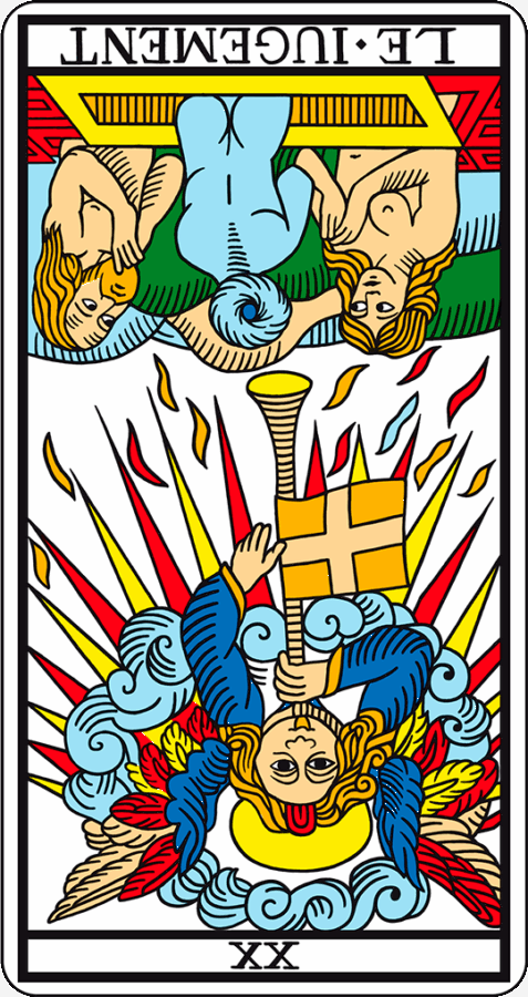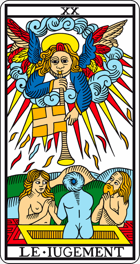 マルセイユ版に描かれる『審判XX』には、雲をまとい空中から現れた巨大な天使が鋭角的な光を放ち、右手はラッパの吹き口を持ち、左手は十字の紋章の入った旗を指差した姿で描かれいます。