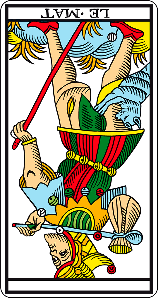 マルセイユ版の「愚者」は、その抽象的な絵柄の為、見方によっては後ろ歩きをしているようにも見えます。