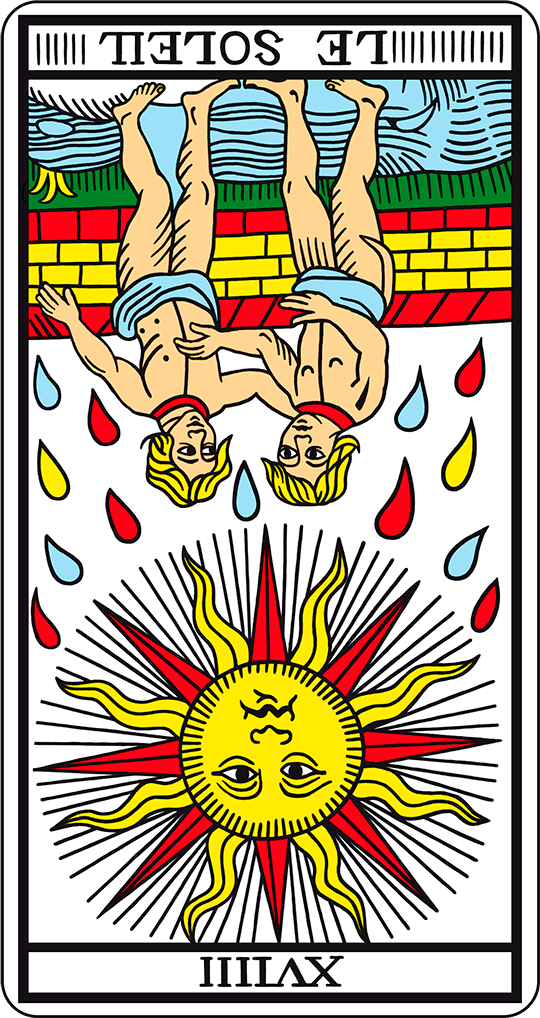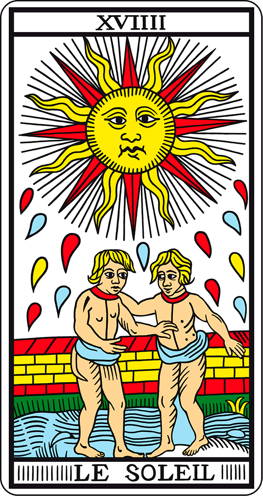 この太陽は8つの赤い光と黄色い光を放っている。同じものが星のカードにも現れていたが、ここでは顔が描かれ、人格化されている。